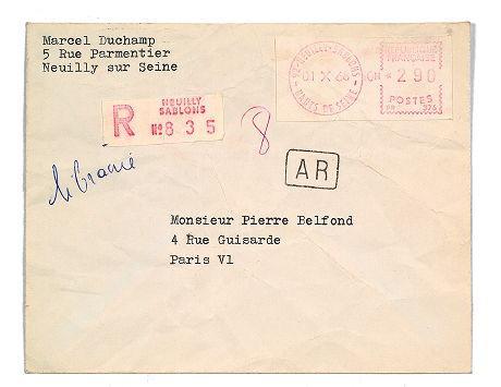 Pour un ready-made, c’en est un fameux… On va découvrir en salle des ventes un document curieux, dont l’estimation est impossible mais qui pourrait bien séduire le musée de Philadelphie, le Getty Institute ou un oligarque fortuné des pays émergents : la dernière missive de Marcel Duchamp. Adressée à un éditeur, Pierre Belfond, elle n’a rien d'un double sens. Elle l’enjoint simplement de lui payer au plus vite ses droits d’auteur pour une série d’Entretiens menés avec le critique Pierre Cabanne. Datée du 29 septembre 1968, elle est en réalité postée (avec accusé de réception) le 1er octobre, jour d’une soirée arrosée chez Marcel et Teeny Duchamp, au 5 rue Parmentier, à Neuilly, où sont présents Robert Lebel et Man Ray. Duchamp se montrera plus rapide que la poste : quand Belfond reçoit la lettre, le 3 octobre au petit déjeuner, l’artiste s’est déjà éteint, la veille, à une heure du matin. C’est le dernier happening de Duchamp : une lettre morte…