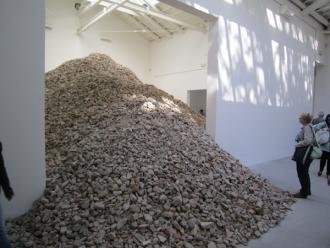 A second theme across several pavilions is the Biennale itself. Art about the Biennale, or about Venice, is a longstanding trope, and gets quite a workout this year. Romania’s “An immaterial retrospective of the Venice Biennale” has actors re-enacting themes from previous Biennales, including reciting documents from the Biennale archives (we heard Sophie Calle’s “Dear Jane” letter from the 2007 French pavilion); Lara Almarcegui (filling the Spanish pavilion with glass, earth, and bricks in proportion that these materials comprised the buildings’ construction); and Chilean Alfredo Jaar’s Venezia, Venezia (a scale model of all the pavilions in the Giardini, that rises from and sinks back into a pool of water). Are we to read these as critiques of the national pavilion system? This issue is dead. It has been undercut in so many ways and by so many countries (think Germany and France swapping their pavilions this year) that an artist who comes to the Biennale and only comments on the venue is wasting an opportunity to address more important issues.